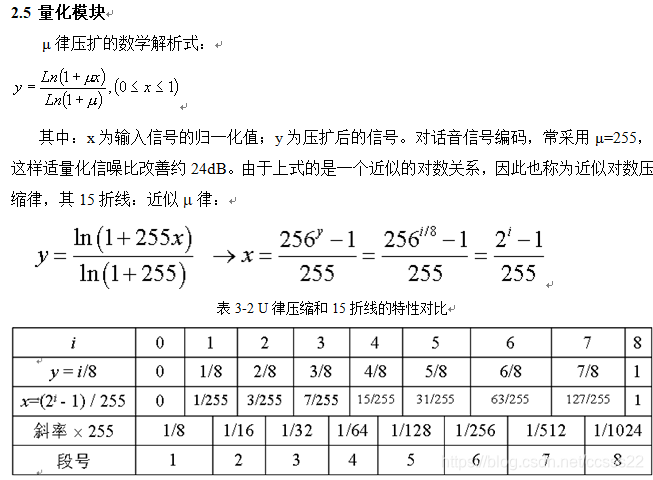 μ律(m-Law)压扩主要用在北美和日本等地区的数字电话通信中。m为确定压缩量的参数,它反映最大量化间隔和最小量化间隔之比,通常取100≤m≤500。由于m律压扩的输入和输出关系是对数关系,所以这种编码又称为对数PCM。