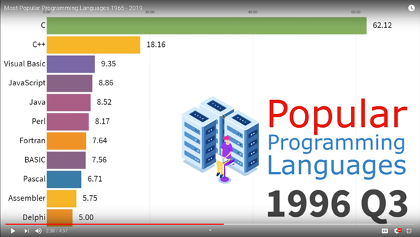 我认为对于我的理论来说,Java 是一个非常有意思的例子。关于 Java 流行的常见解释是“ Sun 给力的营销”,以及随后大学的课程中引入了 Java 。但对我来说,这似乎没有说服力。我们来看一下90年代流行的编程语言(我不确定此处的百分比和相对排名,但是对我来说,大致是正确的):