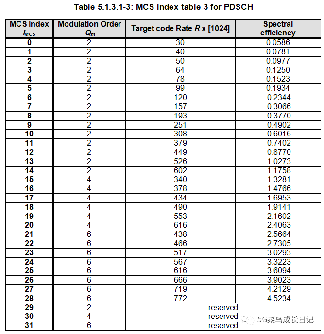 为了提高可靠性,URLLC传输时候使用计算TB Size的表格,对比前面两个表格,同一个MCS,码率都要远低于Table 5.1.3.1-1和Table 5.1.3.1-2。