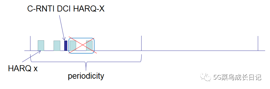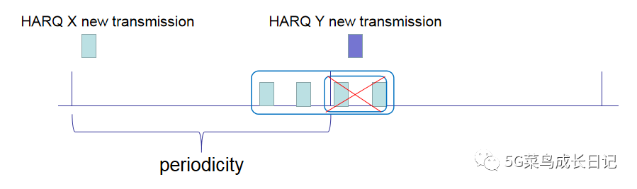 情况二 在Configured Grant的周期边界未到达最大重复传输次数,由于下一个周期开始是固定调度进程新数据