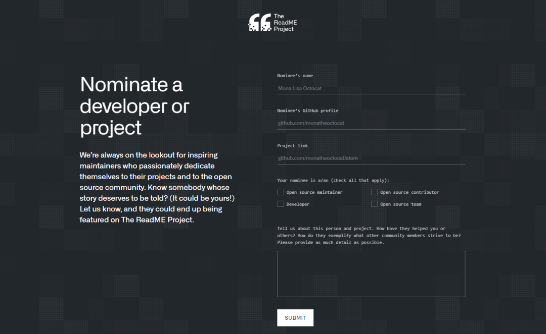 如果你认识一个值得讲述的故事的人(也可以是你自己!),可以到 GitHub Nominate[7] 中进行提名,一旦被选上,就会展示在 GitHub 官方 ReadME 项目中。