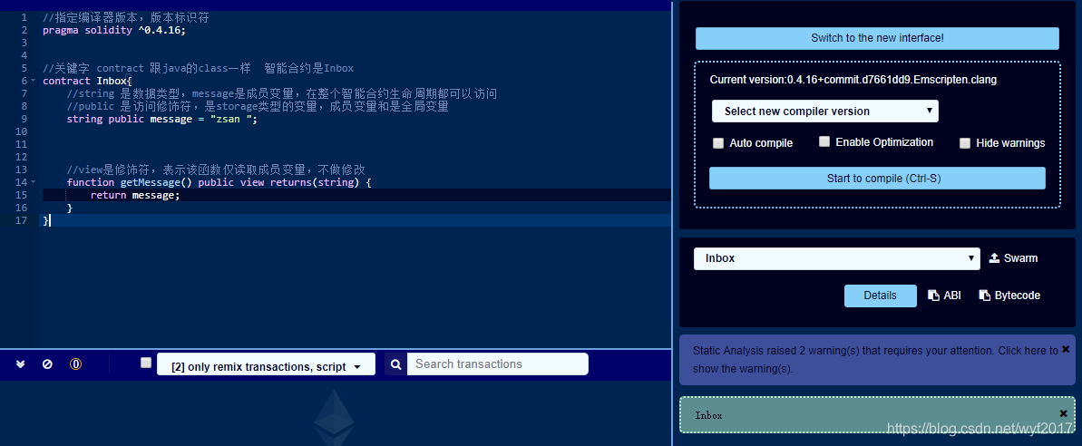 网上大多数教程是2017/2018的,现在是2020年经过2年的发展Remix-Ethereum IDE 版本更新了很多,所以经过我自己的测试0.4.0到0.4.15的版本不兼容了,所以我们只需要更换下版本号为 0.4.16(>=0.4.16就可以)