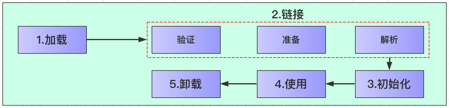 类加载阶段分类:加载、链接(验证/准备/解析)、初始化(<cinit>()V方法 / 发生的时机),如下图所示: