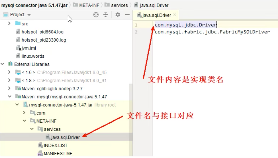 约定如下,在 jar 包的 META-INF/services 包下,以接口全限定名名为文件,文件内容是实现类名称。即根据接口找到文件,文件内容是要加载类的类名