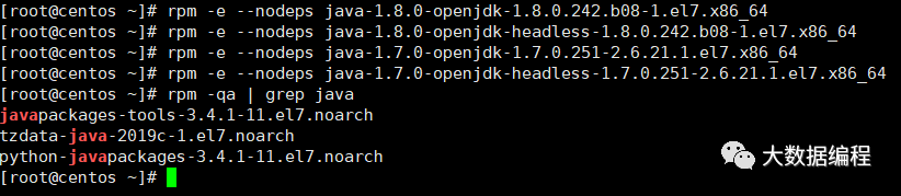 使用命令`rpm -e --nodeps 系统自带的jdk文件名`删掉黄色框起来的四个,另外三个不要动