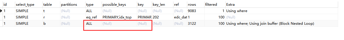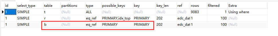 从执行计划中可以看出 t 嵌套连接 r 的时候走的是 主键索引,但是继续嵌套连接 b 的时候,却是走的 全表扫描! 那么可能很有可能问题就出在这个地方,为什么 b 表没有走索引,是因为缺失了索引吗?