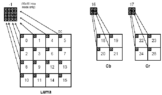 无论是经过帧内预测还是帧间预测,残差宏块都需要进行变换和量化。以前的标准一般采用8×8的DCT变换。H.264根据残差数据的类型采用三种不同的方式:帧内编码宏块的亮度DC系数采用4×4的矩阵(仅对于16×16的预测模式);色度DC系数使用2×2的矩阵;其他的都采用4×4的块变换。宏块里数据块按图3-4所示的顺序传输。如果是16×16的帧内预测宏块,首先传输编号-1的亮度DC系数,然后是编号0-15的亮度残差数据,最后是编号16-25的色度DC和色度残差数据。