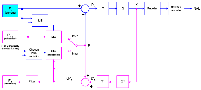 Fn为当前输入帧。它以宏块为单元进行处理(对应原来图像的16×16个像素)。每个宏块按照帧内或者帧间模式被编码。无论那种模式,都会由重建帧形成一个预测块P。如果是帧内模式,P由当前已经被编码,解码并且重建的帧n的采样值来预测。如果是帧间模式,P从以前的一个或者多个运动参考帧的运动补偿中获得。即图中的F’n-1,每个宏块的预测可由以前的一帧或者几帧已经编码,重建的图像得到。