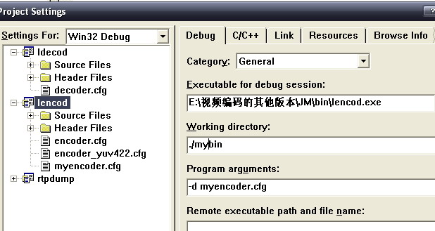 然后在选中lencod files 在工程的菜单下setting的DEBUG设置如图参数设置: