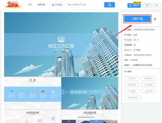 找到喜欢的述职汇报类PPT模板后,点击该模板,进入模板详情页,点击右方的【立即下载】即可。