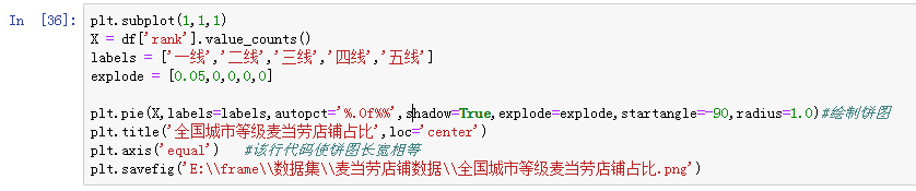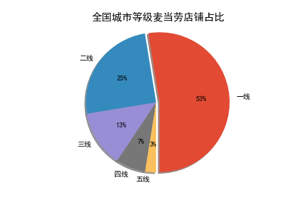 结论:从上图看出,全国城市等级所对应的麦当劳占比,一线,二线,三线,四线,五线,依次递减,一线城市拥有的麦当劳数时最多的,从而验证了我们的想法,城市等级越高,麦当劳数也相应的多一些 。