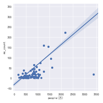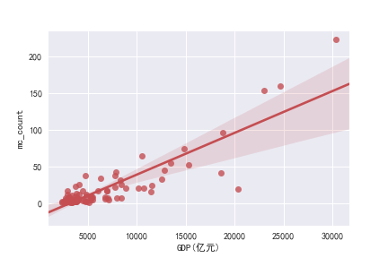 结果图中虽然店铺数不够的柱状图不够明显,但是从数字上以及上面的“店铺数-城市(横柱状图)”可以看出店铺数与GDP值的趋势基本一致,也就是说GDP也是一个影响一个城市麦当劳店铺数的因素。下面我们对GDP与麦当劳店铺数做一个回归模型,来验证我们的说法。