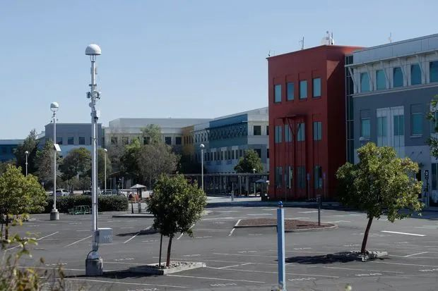 图示:4月中旬,位于加州门洛帕克的Facebook办公园区停车场空空如也