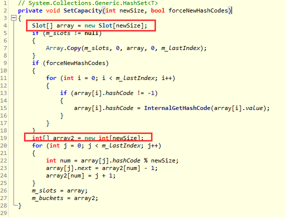 HashSet的时间和空间上虚占远比你想象的大很多,而且实占也不小,因为底层用到了双数组 m_slots 和 m_buckets,每个Slot还有三个元素: struct Slot { int hashCode;internal int next;internal T value; },所以了解完原理之后谨慎着用吧。