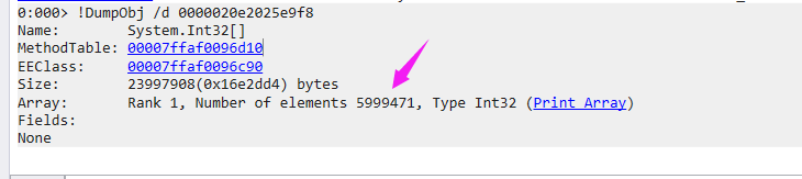 从上面可以看到,我通过 gcroot 去找这三个地址的引用根,有两个是没有的,最后一个有的自然就是新的 599w 的size,对不对,接下来用 !do 打出这三个地址的值。