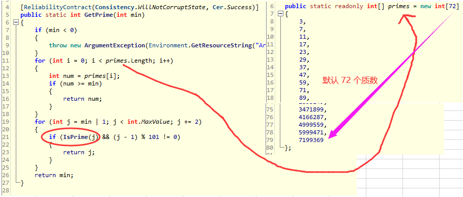 从图中看,HashSet底层为了加速默认定义好了 72 个质数,最大的一个质数是 719w,换句话就是说当元素个数大于 719w 的时候,就只能使用 IsPrime 方法动态计算质数,如下代码: