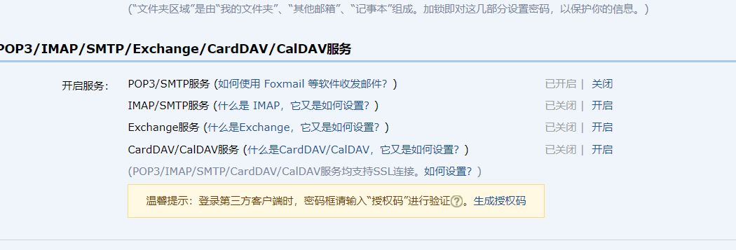 2. 往下滑 找到下面页面 点击“开启”按钮,开启POP3/SMTP服务,根据提示完成开启操作,开启成功后,生成授权码(授权码用于第三方登录,简单说就是用在你写的python程序里进行登录)