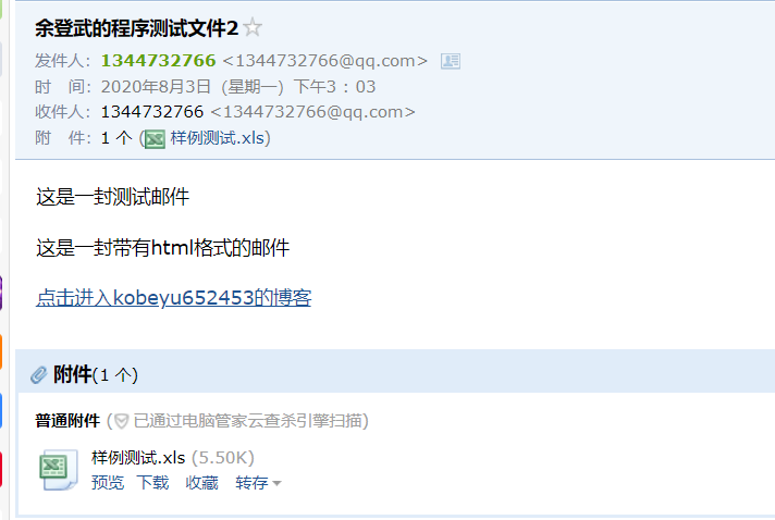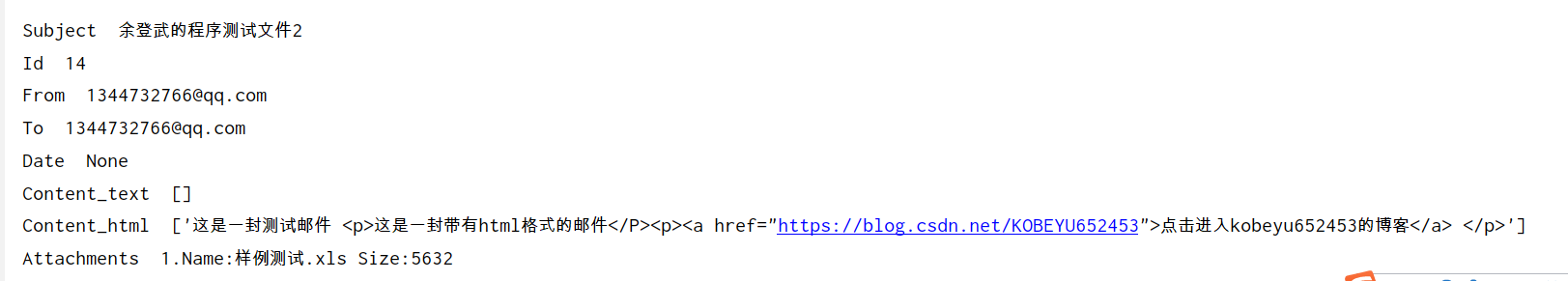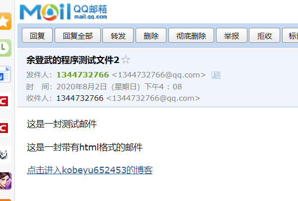 mail_content='这是一封测试邮件 <p>这是一封带有html格式的邮件</P><p><a href="https://blog.csdn.net/KOBEYU652453">点击进入kobeyu652453的博客</a> </p>'#邮件正文内容