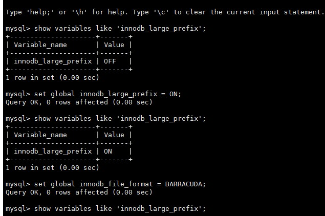 2 、启用innodb_large_prefix选项,将约束项扩展至3072bytes