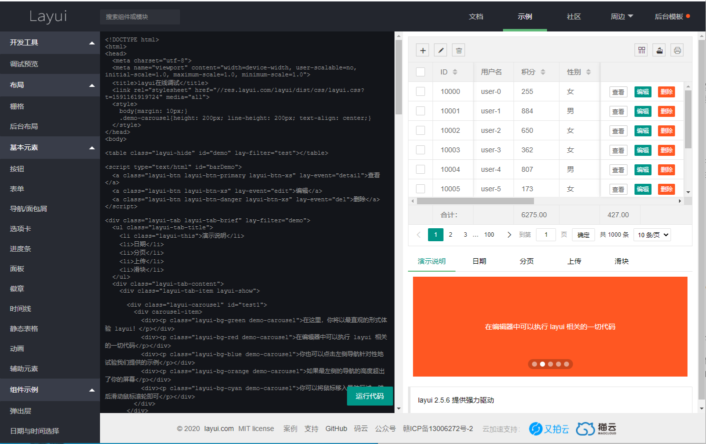 layui(谐音:类UI) 是一款采用自身模块规范编写的前端 UI 框架,遵循原生 HTML/CSS/JS 的书写与组织形式,门槛极低,拿来即用。
