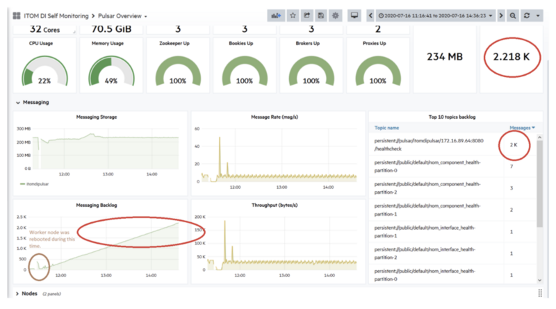 根据上图左边圈出来的部分可以看出,message backlog 一直处于增加的状态。Backlog 就是在消息生产—消费过程中,没有被 consumer 消费掉的消息堆积,正常情况下,producer 生产消息与 consumer 消费消息的速率大致是一样的。但是从上图中的递增状态的 backlog 就表明了,消息生产消费过程中出现了消费不均衡状态。
