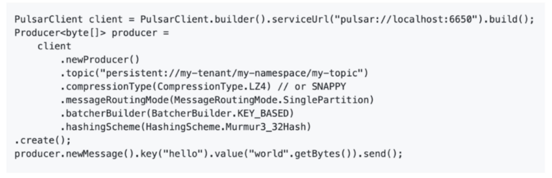 一般为了节约网络带宽,在创建 producer 时,会根据不同场景选择不同的压缩类型。Consumer 端使用了 Key_Shared 订阅模型来订阅 topic,在消息中,标注消息的重要字段可能是 payload 字段。