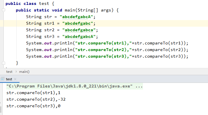 - int compareTo(String str) 会对照ASCII 码表 从第一个字母进行减法运算 返回的就是这个减法的结果,如果前面几个字母一样会根据两个字符串的长度进行减法运算返回的就是这个减法的结果,如果连个字符串一摸一样 返回的就是0。