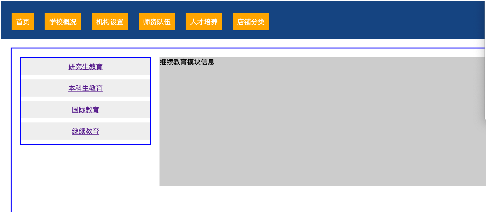 如上图中,“研究生教育、本科生教育、国际教育、继续教育”这些都是人才培养模块下面的信息,他们的内容,应该展示在人才培养页面的 里面的右侧灰色额部分,而不是顶级路由的展示区域。