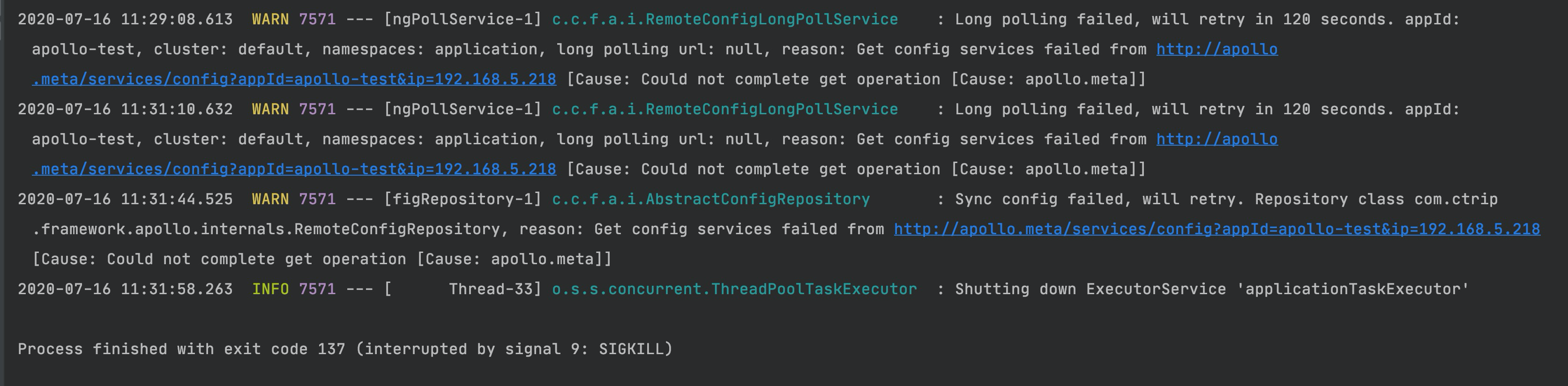 解决方式 修改spirngboot启动jvm参数 -Dapollo.configService=http://外网ip:8080 来源:oschina链接:https://my.oschina.net/u/4182459/blog/4391884 标签 Spring Boot apollo java