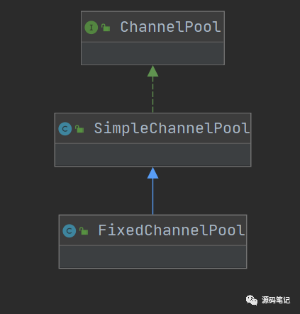 这里用到的是Netty的FixedChannelPool连接池,同时FixedChannelPool继承了SimpleChannelPool,而SimpleChannelPool又实现了ChannelPool接口,如下图:我们先来看下