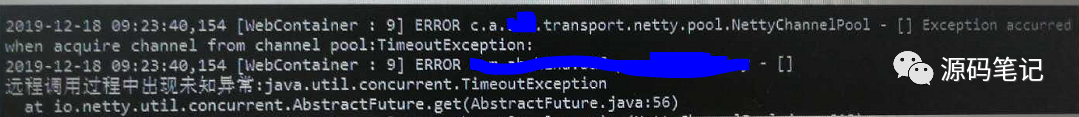 根据报的异常信息可用判断是在进行远程调用前调用CustomChannelPool.acquire方法的Channel ch = fch.get(timeoutMillis, TimeUnit.MILLISECONDS);这句代码从Netty连接池获取连接超时(即10秒后),然后抛出TimeoutException,最后再在CustomChannelPool.acquire方法的catch代码块打印出Exception accurred when acquire channel from channel pool:TimeoutException异常信息,然后再把该异常往外抛出去,即最后会在BusineseService的标号【5】处的代码Channel channel = CustomChannelPool.fixpool.acquire(10000);抛出了一个TimeoutException异常,又因为标号【5】处的代码没有包含在try块内,因此不会执行标号【6】处的finally块释放连接的逻辑。
