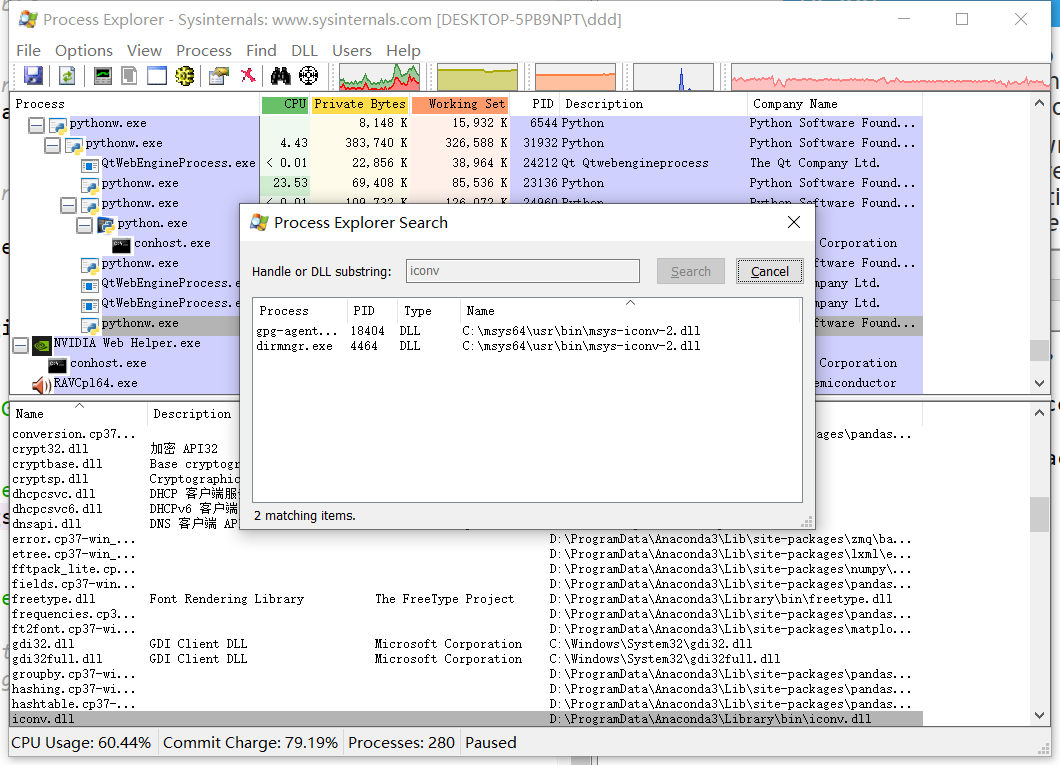 可以看到,现在调用了D:\ProgramData\Anaconda3\Library\bin\iconv.dll这个dll,来自Anaconda虚拟环境的Library,将其重命名为iconv.dll.bak,然后重启spyder,再次用Process Explorer搜索,发现没有再次载入了