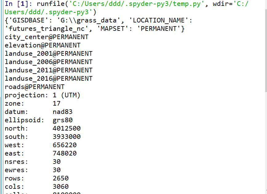 因为想要在Spyder中直接调用GRASS的Python包,实现在外部的IDE中运行GRASS,直接在Spyder中输入官网给出的实现代码,根据实际情况更改gisdb,grassbin目录等: