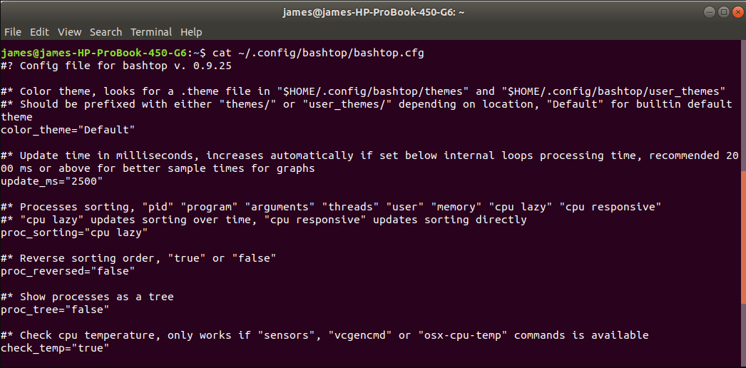 Bashtop的配置文件位于~/.config/bashtop/bashtop.cfg位置。您可以根据需要更改参数,以自定义终端上指标的外观和输出。
