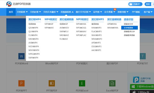 第一步:在打开的“迅捷PDF转换器”网站里,我们在上方依次选择“音视频转换”——“语音识别”——“文字转语音”功能。