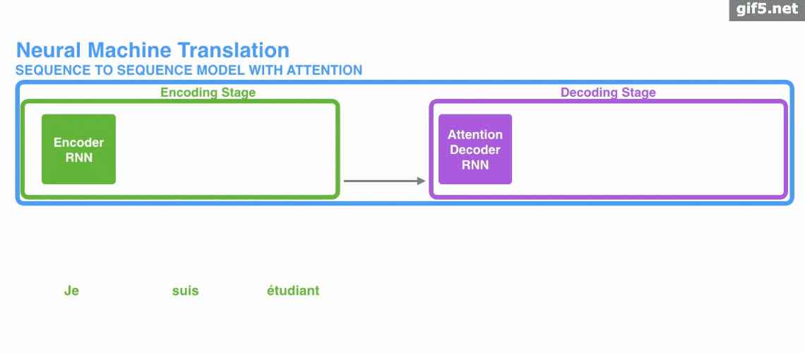 下面的动图演示了attention 引入 Encoder-Decoder 框架下,完成机器翻译任务的大致流程。