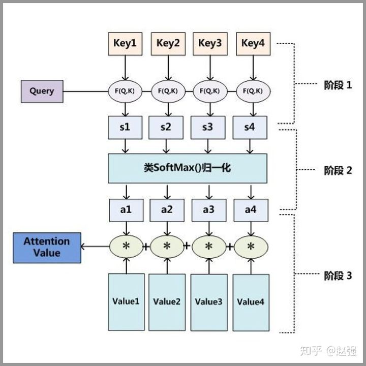 从上面的建模,我们可以大致感受到 Attention 的思路简单, 四个字“带权求和”就可以高度概括,大道至简。做个不太恰当的类比,人类学习一门新语言基本经历四个阶段:死记硬背(通过阅读背诵学习语法练习语感)->提纲挈领(简单对话靠听懂句子中的关键词汇准确理解核心意思)->融会贯通(复杂对话懂得上下文指代、语言背后的联系,具备了举一反三的学习能力)->登峰造极(沉浸地大量练习)。