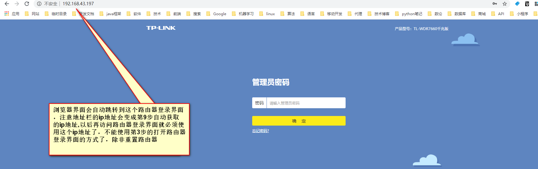 - 当第10步点击完成后,界面会自动跳转到这个地址,并打开路由器登录界面,输入第3步设置的路由密码,点击登录