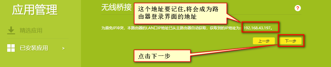 - 连接成功后,点击下一步,要注意记录一下这个界面的ip地址,因为这将是以后路由登录界面的访问地址