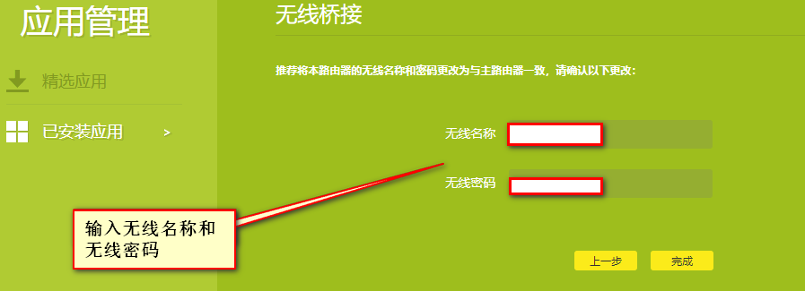 - 设置路由器发射出的无线的名字和密码,点击完成,通俗点讲,可以理解为,别人的手机搜索wiff的时候,在wiff列表里面显示的名字,当他点击这个名字输入你现在设置的密码,就可以连接wiff上网了
