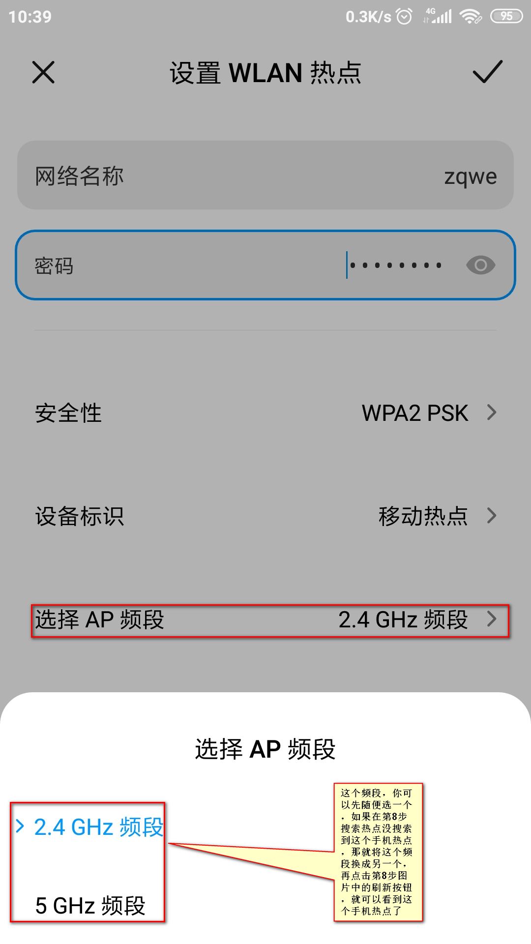 - 打开手机热点,注意开启热点的时候要注意AP频段