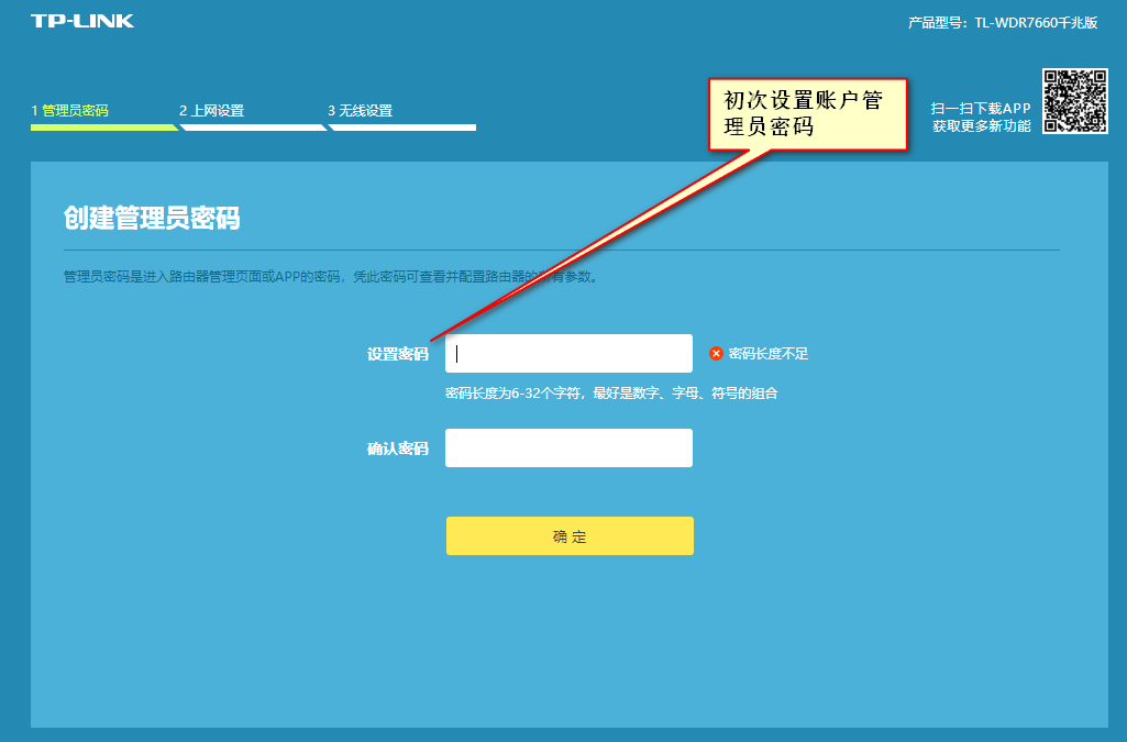 tplogin.cn(如果打不开tp-link的登录界面,就输入192.168.1.1)(注意这是第一次 初始化的时候才可以使用这些方式登录),界面如下,输入设置密码点击确认