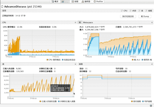 在上图中可以看到加载类的变化图以及堆大小呈锯齿状,说明动态加载类能够被有效的被回收。