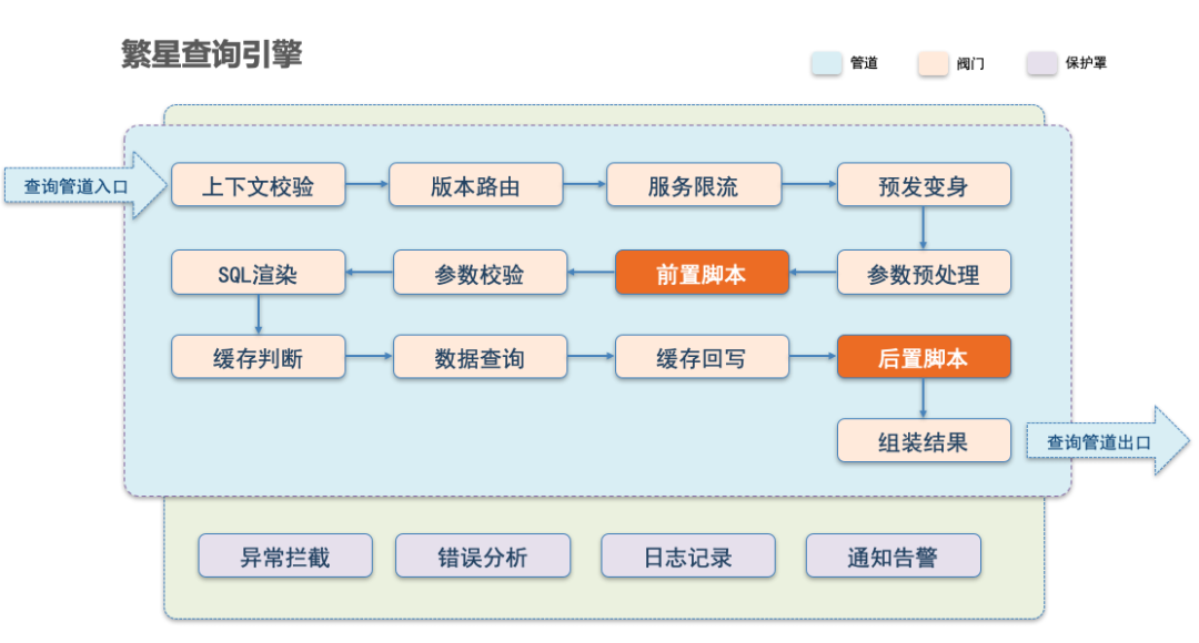 一次查询请求经过引擎的管道,被各个阀门处理后就得到了相应的结果数据。图中高亮的两个阀门就是本文讨论的重点:前置脚本与后置脚本。