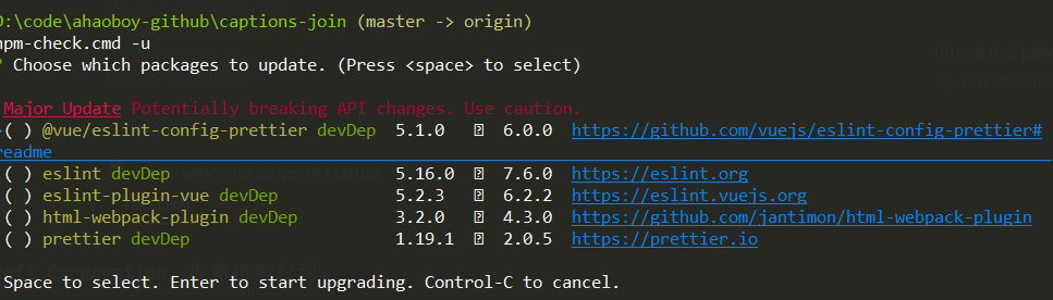 | 更新项目依赖,有交互 | yarn upgrade-interactive --latest | npm-check -u |