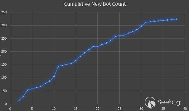我们观察到了2020年2月至2020年4月之间的通知。下图显示了按天数累计的新机器人数量。