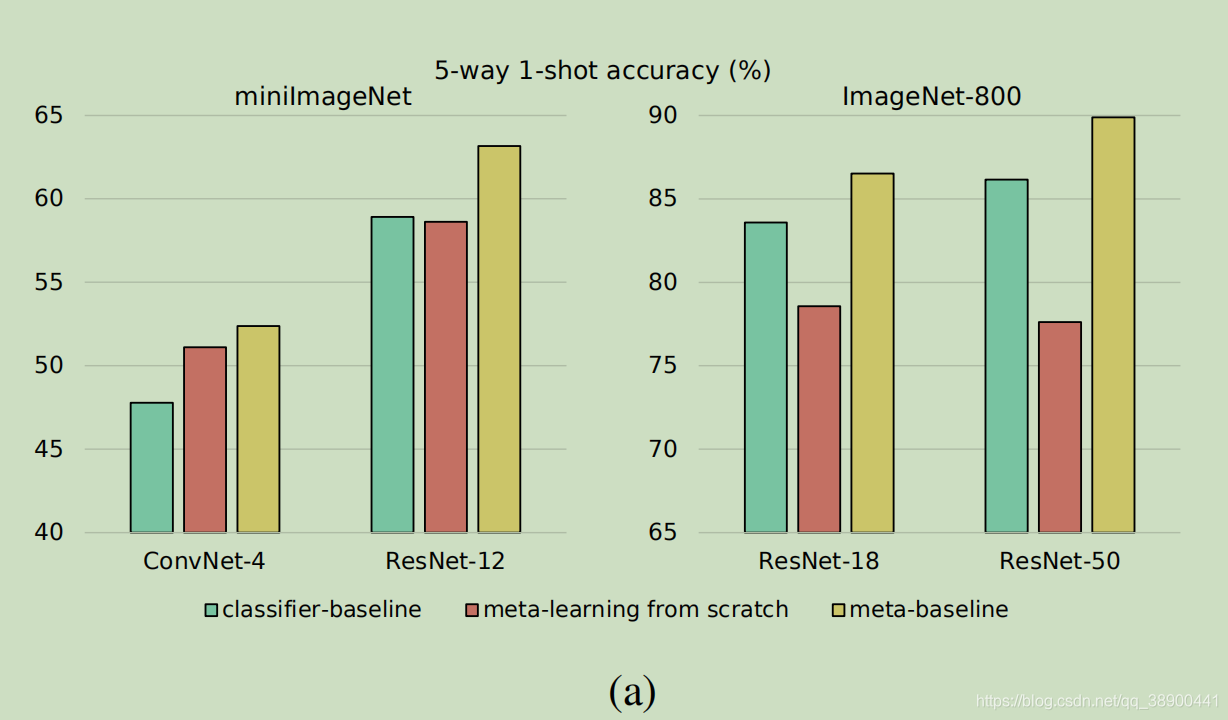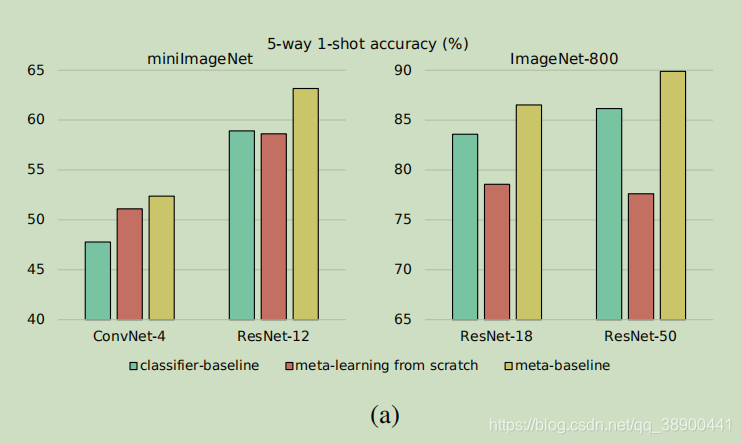 在图1a中,我们还注意到分类器基线(classifier-baseline)优于从零开始的元学习(meta-learning from scratch),除了浅主干ConvNet-4,表明深层骨干(ResNet)也可能改变方法的性能。